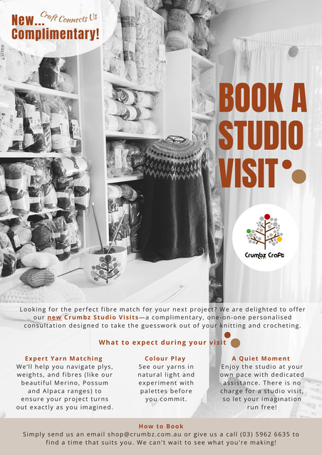 Give us a call at (03) 5962 6635 or drop us a line at shop@crumbz.com.au if you have any questions or need help choosing your yarn, fabric or haberdashery.